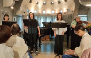 | 星誕音楽堂での発表会は令和元年12月以来5年半ぶり。 コロナ禍で日々の生活が 多くの制約を受けた年月が過ぎ、久々に響きの良いこの会場で演奏できてとても嬉しいです。 ヴァイオリンを含む4人のコーラスも交え、今回はピアノ独奏をメインに開催しました。 ”緊張せずに”この響きを楽しみながら頑張りましょう。また、冬にはアンサンブルをメインに 開催の予定です。と会長・大塚さんの挨拶でした。 (*は演奏動画あり) |